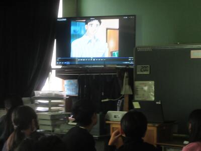 5年生のエプロン、6年生のトートバック。仕上がりが楽しみです。(天井からつるされているのは、ミシンの使い方の手順書です。素敵な工夫です。古い校舎だけど、工夫がいっぱい。)