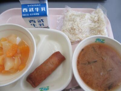 今日の給食は、みそラーメン、はるまき、フルーツあんにん、牛乳でした。