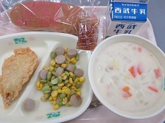 今日の給食は、コッペパン、いちごジャム、しろみざかなフリッター、コロコロソテー、やさいチャウダー、牛乳でした。まだインフルエンザが流行っているので、しばらくは、前向き給食を続けます。体力をつけて乗り切りましょうね。