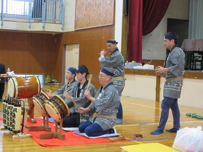 ジネンジョ太鼓の太鼓演奏。お祝いをしてくださいました。獅子も近づいてきました。