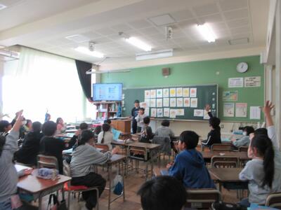 クラスの友達は、みんなで英語でヒントを出します。「伝えたい」という気持ちが「何とか表現しよう」という意欲をかきたて、クラスが一つにまとまっていました。外国語活動支援員のU先生も、そばでそっと勇気づけをしています。U先生がいるから勇気がでるのかもしれません。