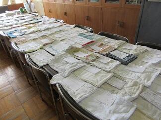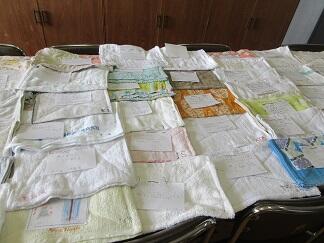 今日のなかよしタイムに、大きな箱をかかえて6年生のAさんとTさんが訪ねてきてくれました。6年生全員が作った雑巾を届けてくれました。一枚一枚にメッセージがついています。それにイニシャルが刺繍されているのです。大切に使わせてもらいますね。ありがとう。