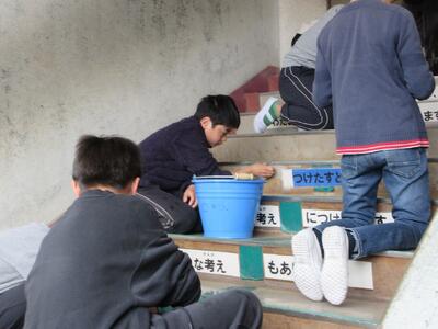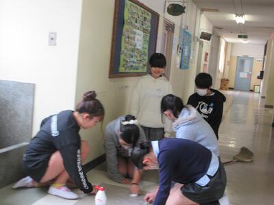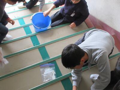 今日は、廊下や階段で6年生が一生懸命、床を磨いてくれました。テープのあとを丁寧にはがしてくれていたのです。古い校舎ですから、どうしても白い床にも汚れが目立ちます。でもこうやって心を込めて磨いてくれて校舎も喜んで