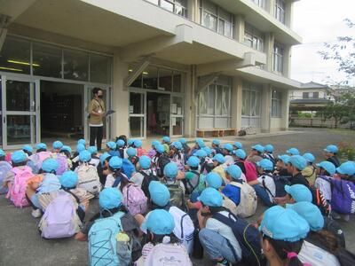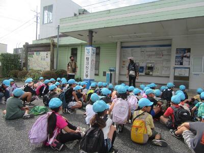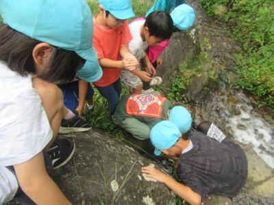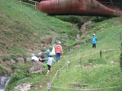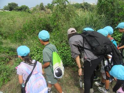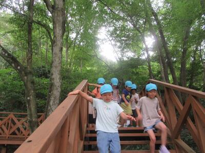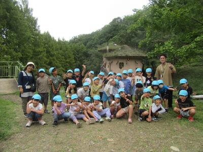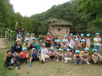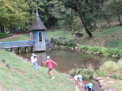 公園についてから、水色帽子の山口小の子どもたちの元気なこと。水場でザリガニを見つけたり、カニを見つけたり、芝生でバッタをとったり。きのこの家や、森の家や、木のアスレチックも楽しんでいました。よかったですね。