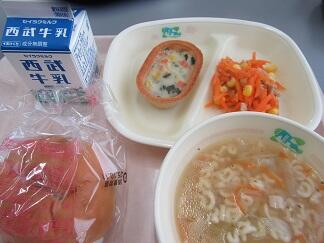 今日の給食は、ライスボールパン、ポテトカップグラタン、キャロットサラダ、ABCスープ、牛乳でした。とっても彩りがきれいでした。それにABCスープは大人気です。