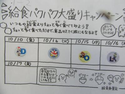 「自分たちの学校を自分たちでよりよくしていこう。」と子どもたちが意欲的に活動する姿は至る所にあるのです。10月10日から10月17日まで、「給食パクパク大盛りキャンペーン」をやってくれています。