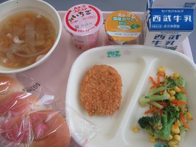 今日の給食は、ツイストパン、かぼちゃコロッケ、ブロッコリーのサラダ、やさいスープ、いちごヨーグルト、牛乳でした。きれいな彩りの給食で、残食も少なかったですよ。給食委員さんどうもありがとう。