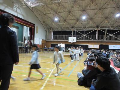 1年生が入場してきました。みんなはずかしそうで、うれしそう。おうちの方に見ていただけることは特別です。
