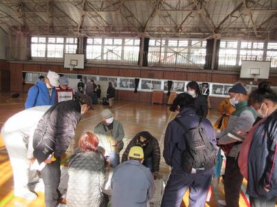 体育館で地区ごとにカードを使っての避難所運営訓練。HUG訓練とは、避難所で実際に起こりうる課題や要望をゲーム形式で疑似体験し、避難所の在り方について学ぶものだそうです。