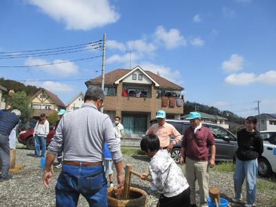 学区の中の上山口水田で、もちつき大会がありました。山口小学校でも親子で参加している家庭がありました。