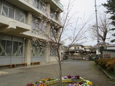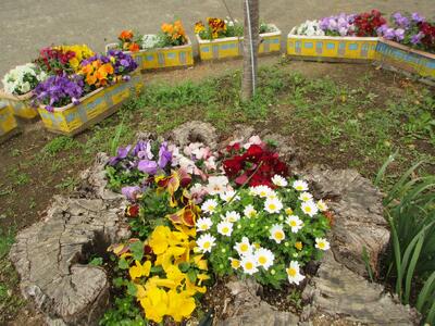 職員玄関前の小さな桜の苗木に、今年はたくさん花が咲きました。職員玄関前には立派な桜があったそうですが、倒木の危険があり、惜しまれながら伐採しました。その時にその横にその桜を苗木を植えたそうです。新しい歴史の始まりですね。切り株には春の花が元気に咲いています。